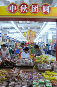 南京大多月餅不漲價(jià)。9月6日,幾位顧客正在一家超市中選購月餅。新華社記者:楊磊