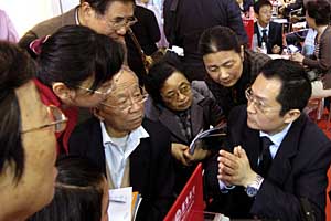 一家銀行的工作人員(右一)在教市民理財(cái)。新華社記者 孫參
