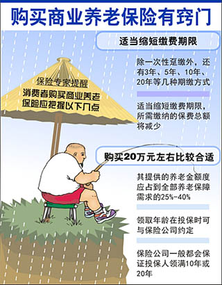 既然在短時間內(nèi)很大一部分人難以從企業(yè)年金中受惠,再加上目前社保相對較低的保障水平,因此,人們退休后能否過上較為寬裕閑適的老年生活,很大程度上有賴于個人商業(yè)養(yǎng)老保險。 據(jù)了解,目前市場上的個人商業(yè)養(yǎng)老保險可以分為傳統(tǒng)型和年金分紅型,在購買時一般還可以有附加險,如:醫(yī)療、意外、健康等,使投保人得到更全面的保障。傳統(tǒng)型養(yǎng)老保險包括兩全保險、定期保險和終身保險等幾種,到了合同約定時間就可以按月或按年領(lǐng)錢,一直領(lǐng)到終身或約定時間,一般都能保證至少領(lǐng)取10年。 分紅型養(yǎng)老險則是一種較傳統(tǒng)養(yǎng)老險有所改進(jìn)的新品種,領(lǐng)取方式相同,但具有分紅的功能!氨kU公司在每個會計年度結(jié)束后,會將上一會計年度該類分紅保險的可分配盈余按一定的比例以現(xiàn)金紅利或增值紅利的方式分配給客戶。在當(dāng)前降息周期下,分紅險因具有滿期給付保險金的保底收益和不封頂?shù)募t利以及免稅功能而受到市場青睞!毙耪\人壽保險公司北京分公司業(yè)務(wù)總監(jiān)石宗鑫對記者介紹說,像近日公司新推出的“安享未來”養(yǎng)老年金計劃就會依據(jù)經(jīng)營情況每年分配現(xiàn)金紅利,另外,保單生效10年后,還可以享有特別紅利。 據(jù)了解,自新春以來,包括中國人壽、恒安標(biāo)準(zhǔn)人壽、長城人壽、中意人壽等十余家保險公司都陸續(xù)推出了自己的分紅險新產(chǎn)品。