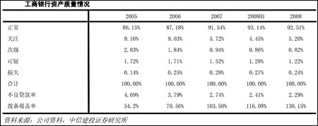 工行2008年不良貸款繼續(xù)雙降,年末不良貸款余額1044.82億元,較2008年初下降了72.92億元,不良貸款率較年初下降0.46%個百分點(diǎn),撥備覆蓋率(不計(jì)稅后利潤中計(jì)提的一般準(zhǔn)備)達(dá)到130.15%,工行的信貸資產(chǎn)配置比較穩(wěn)健,基礎(chǔ)設(shè)施、公用事業(yè)等低風(fēng)險政府背景項(xiàng)目貸款比重較高,預(yù)計(jì)其資產(chǎn)質(zhì)量在2009年和2010年有望保持穩(wěn)定。