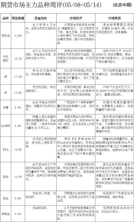 期貨市場主力品種周評(5月8日-14日)