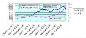 圖1是道瓊斯指數(shù)與黃金的相關(guān)分析圖,數(shù)據(jù)記錄是從1989年10月31日到2007年11月,兩者的相關(guān)系數(shù)是0.38789。
