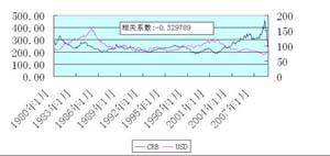 圖4是CRB與美元的相關(guān)系數(shù)圖,數(shù)據(jù)記錄是從1980年1月份到2008年底,它們的相關(guān)系數(shù)是-0.329789,是呈負的相關(guān)性。
