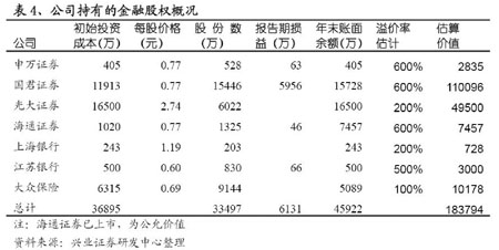 興業(yè)證券的研究報告稱,由于國企的優(yōu)勢,大眾交通擁有了多家金融機構和上海較好企業(yè)的法人股,該部分資產的公允價值大大高于賬面價值。大眾交通現有賬面價值4.59億元的金融機構股權,其中海通證券已上市,價值7457萬,其余為國泰君安、光大證券等非上市證券公司,依照海通證券的溢價情況,粗略估計大眾交通金融股權的溢價為3倍左右,相當于增加資產價值13.7億,每股價值0.87元。