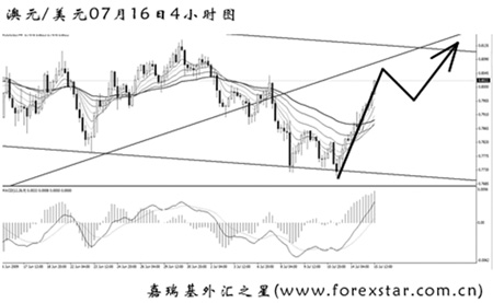 ▲澳元兌美元短線上升動(dòng)能充足,預(yù)計(jì)匯價(jià)向通道上沿挺進(jìn)的概率很大。中間會(huì)出現(xiàn)次要節(jié)奏調(diào)整,可尋找在調(diào)整內(nèi)部做多澳元的機(jī)會(huì)。