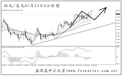 ▲歐元兌美元匯價已將最近的一條上升趨勢線跌破,下方明顯支撐在道氏理論的顯著低點1.4065。目前歐元的漲勢良好,即將面臨的阻力在6月初高點1.4340。預(yù)計后市匯價調(diào)整過后將向此位置進發(fā),突破的概率不低。