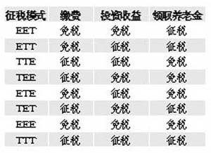 通常情況下,我們將企業(yè)年金基金運行分成三個環(huán)節(jié),分別是籌資繳費環(huán)節(jié)、投資積累環(huán)節(jié)和領取給付環(huán)節(jié),針對各個環(huán)節(jié)稅收待遇又可以簡單地區(qū)分為征稅(taxing,T)和免稅(exempting,E)兩種,由此構成了各種稅收優(yōu)惠類型,下表列出了政府對上述三個環(huán)節(jié)征稅的八種模式: