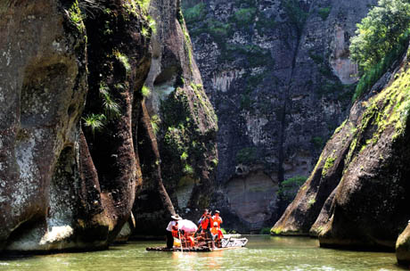 作為2009年中國唯一的世界自然遺產(chǎn)申報項目,由福建泰寧、湖南崀山、廣東丹霞山、江西龍虎山、貴州赤水、浙江江郎山六個著名丹霞地貌風景區(qū)捆綁組成的“中國丹霞”申遺工作已經(jīng)進入關(guān)鍵階段,將于9月接受世界自然保護聯(lián)盟專家實地考察評估。圖為游客乘坐竹排飽覽泰寧丹霞風光。