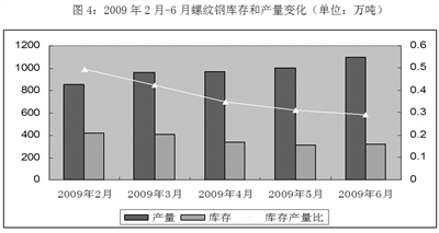 圖4:2009年2月-6月螺紋鋼庫(kù)存和產(chǎn)量變化(單位:萬(wàn)噸)