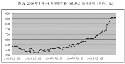圖5:2009年3月-8月印度粗粉(63.5%)價(jià)格走勢(shì)(單位:元)
