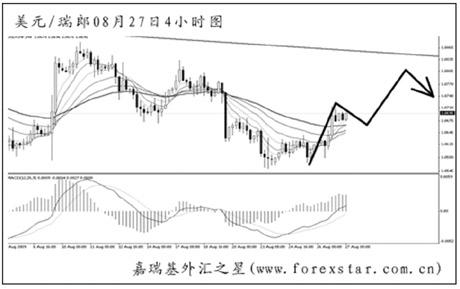 ▲美元兌瑞郎再度創(chuàng)出新低之后仍未能加速下行,日線(xiàn)圖下跌動(dòng)能持續(xù)減弱。短線(xiàn)匯價(jià)波動(dòng)凌亂,后市有向圖中的下降通道上沿發(fā)起沖擊的欲望。由于低位震蕩的時(shí)間已不短,形成階段性底部的可能性正在逐漸加大。