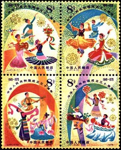 在這些郵票中,較為引人注目的當(dāng)屬紀(jì)71選用著名畫家董希文的《開(kāi)國(guó)大典》油畫,頗具收藏價(jià)值,而紀(jì)106和J47都采用了畫面圖案相連的連票形式,讓人有豁然開(kāi)朗、耳目一新的感覺(jué),其中紀(jì)106郵票為新中國(guó)第一套票面圖案相連的連票形式;再者就是1999年發(fā)行的這套枚數(shù)最多、面值最高的套票版張紀(jì)念郵票《民族大團(tuán)結(jié)》了,以中國(guó)畫工筆重彩畫法設(shè)計(jì),每個(gè)畫面均選用祖國(guó)各民族最富特色的服飾,由男女二人組成的各種舞蹈構(gòu)圖,具有很高的觀賞價(jià)值,確實(shí)令人喜愛(ài)。