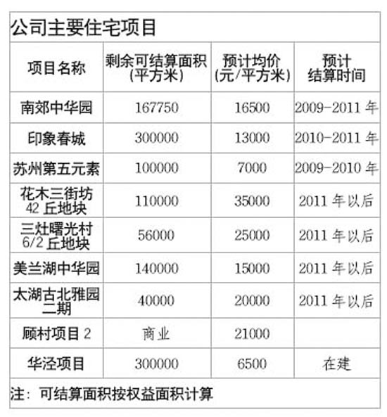 公司今明兩年的盈利主要來自于南郊中華園項(xiàng)目、印象春城項(xiàng)目和蘇州第五元素等住宅項(xiàng)目,以及華寧國際廣場(chǎng)、萬泰大廈、上海國際客運(yùn)中心等商業(yè)項(xiàng)目。2011年之后,花木的高檔裝修公寓、三灶的獨(dú)棟別墅以及美蘭湖中華園等盈利能力較強(qiáng)的項(xiàng)目將進(jìn)入結(jié)算,公司業(yè)績(jī)也有較大保障。
