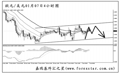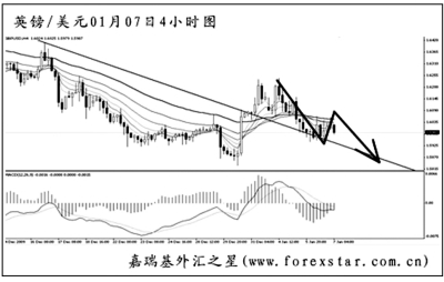 ▲英鎊兌美元將下降趨勢線升破后未能加速上行,目前在對趨勢線發(fā)生回抽。從日線圖上看,英鎊此波下跌的目標(biāo)仍在1.5700一線,尚有一定的空間。圖中的MACD處于空頭動能充盈階段,預(yù)計(jì)英鎊小幅回調(diào)后再度創(chuàng)出新低的概率較大。