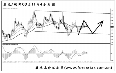▲美元兌瑞郎4小時(shí)圖此前發(fā)生了一連串的MACD頂背離信號(hào),且上升趨勢(shì)線已被跌破。目前美元兌瑞郎處于高位盤(pán)整區(qū)間內(nèi)部,下沿的支撐在1.0680一線。除非匯價(jià)順利跌破道氏理論顯著低點(diǎn)1.0645的支撐,否則美元兌瑞郎仍有很大的希望再度發(fā)力沖高。