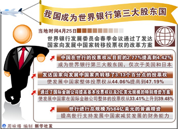 國際貨幣基金組織(IMF)和世界銀行春季會議25日在華盛頓閉幕。會議結(jié)束后,世行行長佐利克感慨地說,這是“多邊主義的美好一天”;IMF總裁卡恩也說,這是世界銀行歷史上“非常重要的一天”。 之所以美好和重要,這是因為在25日的世行發(fā)展委員會上,世行通過了新一輪投票權(quán)改革方案:發(fā)展中國家在世行的投票權(quán)因此增加了3.13個百分點,即從44.06%提高到47.19%;中國在世行的投票權(quán)則從2.77%提高到4.42%,僅次于美國和日本。
