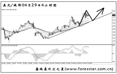 ▲美元兌瑞郎沿趨勢線緩步爬升,目前已經接近了1.0900一線的前方高點阻力,能否突破此位置成為后市繼續(xù)上漲的關鍵。短線美元兌瑞郎上行力度較強,圖中均線系統起到了較好的依托作用。預計美元兌瑞郎走勢還將有一定的反復性,后市將以探底回升的節(jié)奏運行。