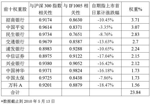 滬深300指數(shù)是滬深300指數(shù)期貨的現(xiàn)貨指數(shù),期指上市近一個(gè)月以來(lái)滬深300和IF1005相關(guān)性高達(dá)0.9939。通過(guò)格蘭杰因果關(guān)系檢驗(yàn)分析,我們發(fā)現(xiàn)滬深300的變動(dòng)是IF1005變動(dòng)的原因,也即前者對(duì)后者起著引導(dǎo)作用。所以分析滬深300權(quán)重股的走勢(shì)對(duì)預(yù)測(cè)期指的走勢(shì)具有重要參考意義。 在滬深300指數(shù)前十大權(quán)重股中有五只銀行股、兩只保險(xiǎn)股、一只券商股、一只能源股和一只地產(chǎn)股。這十只股票占滬深300指數(shù)的權(quán)重達(dá)到了23.84%。它們與滬深300指數(shù)的相關(guān)性也非常高,都在0.89以上。 從這十只股票的漲跌幅來(lái)看,受地產(chǎn)調(diào)控政策影響的萬(wàn)科跌幅達(dá)18.47%,中信證券自5月4日復(fù)牌后,到13日累計(jì)跌幅也達(dá)17.04%。權(quán)重股的巨大跌幅是拖累現(xiàn)指和期指下行的最重要因素。 從行業(yè)基本面來(lái)看,銀行、地產(chǎn)等板塊基本面在國(guó)家宏觀調(diào)控下都偏弱,這也給股指和期指的中期偏弱運(yùn)行定下了主基調(diào)。