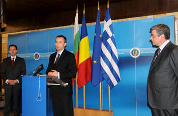 5月21日,羅馬尼亞外長巴孔斯基(右)、希臘代外長茲魯察斯(中)和保加利亞外長姆拉德諾夫在羅馬尼亞首都布加勒斯特出席記者招待會。當天,三國外長在布加勒斯特舉行會晤,主要討論共同應對當前經(jīng)濟危機、加強地區(qū)各領域合作等問題。新華社記者