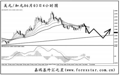 ▲美元兌加元經(jīng)過(guò)了一波強(qiáng)力的反彈之后下落調(diào)整,圖中的上升趨勢(shì)線為日線圖形成,預(yù)計(jì)將對(duì)匯價(jià)產(chǎn)生一定的支撐作用。美元兌加元最近一段時(shí)間的走勢(shì)凌亂,對(duì)交易不利,F(xiàn)重點(diǎn)觀察此趨勢(shì)線的支撐力度,若不能跌破,后市還將有一波明顯的上行。 |