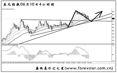 過去的一周,萬眾聚焦的美國5月非農(nóng)報(bào)告隆重出爐,數(shù)據(jù)的疲軟,加之匈牙利可能出現(xiàn)主權(quán)債務(wù)違約,再度點(diǎn)燃了歐元區(qū)主權(quán)債務(wù)危機(jī)憂慮,導(dǎo)致全球股市紛紛重挫,風(fēng)險(xiǎn)規(guī)避情緒卷土重來。 美國勞工部上周五公布的數(shù)據(jù)顯示,5月份非農(nóng)就業(yè)人口增加43.1萬人,低于經(jīng)濟(jì)學(xué)家預(yù)期的增加51.3萬人,但仍創(chuàng)下2000年3月份以來最大單月增幅。4月份非農(nóng)就業(yè)人數(shù)增加29萬人,未進(jìn)行修正。表面上看,盡管美國5月非農(nóng)數(shù)據(jù)低于預(yù)期約8萬人,但卻以10年來最快速度大幅增加,并且失業(yè)率由4月的9.8%降至5月9.7%。實(shí)質(zhì)上,此次數(shù)據(jù)大增很大程度上是由于美國政府因人口調(diào)查而招聘了41.1萬名臨時(shí)人員,而私營部門就業(yè)人口僅增加4.1萬人(4月增長21.8萬人),導(dǎo)致多數(shù)市場人士認(rèn)為該數(shù)據(jù)十分糟糕,并因此歐美股市受到重挫,市場避險(xiǎn)情緒急劇升溫。總體來說,非農(nóng)數(shù)據(jù)令人失望,民間就業(yè)遠(yuǎn)低于預(yù)期。但有市場人士并不認(rèn)為這個(gè)數(shù)字就意味著就業(yè)市場的復(fù)蘇已經(jīng)停滯,其表明的是,就業(yè)市場恢復(fù)的步伐要慢于某些樂觀預(yù)期。若不考慮5月份非農(nóng)就業(yè)數(shù)據(jù)中人口普查相關(guān)的失真因素,則這份報(bào)告還是非常樂觀的,但如果考慮了這個(gè)因素,實(shí)際的結(jié)果相當(dāng)令人失望。即使失業(yè)率下降也不值得慶賀,因?yàn)橄陆档脑虿⒉涣钊藵M意。 美元指數(shù)現(xiàn)已突破了圖中三角形上升中繼的上沿,主趨勢延續(xù)。從空間上看,上方美元指數(shù)的重要阻力在去年3月的高點(diǎn)89.65,預(yù)計(jì)美元指數(shù)順利突破此位置有一定難度。4小時(shí)圖發(fā)生了一連串的MACD頂背離信號(hào),但包含背離點(diǎn)的趨勢線尚未被跌破,短線關(guān)注此趨勢線87.25的支撐力度,后市美元指數(shù)繼續(xù)上沖的希望較大。 未來一周需要重點(diǎn)關(guān)注的財(cái)經(jīng)數(shù)據(jù)及事件包括:6月11日,美國公布5月政府預(yù)算(前值-826.9億美元)、5月零售銷售月率(前值+0.4%)、6月密歇根大學(xué)消費(fèi)者信心指數(shù)初值(前值73.6)、4月商業(yè)庫存月率(前值+0.4%),英國公布4月工業(yè)產(chǎn)出月率及年率(前值2.0%、2.0%);6月14日,歐元區(qū)公布4月工業(yè)產(chǎn)出月率及年率(前值+1.3%、+6.9%);6月15日,日本央行公布利率決議、澳聯(lián)儲(chǔ)公布6月貨幣政策會(huì)議記錄、英國公布5月消費(fèi)者物價(jià)指數(shù)月率及年率(前值+0.6%、+3.7%)、德國公布6月ZEW經(jīng)濟(jì)景氣和現(xiàn)況指數(shù)(前值45.8、-21.6)、美國公布6月紐約聯(lián)儲(chǔ)制造業(yè)指數(shù)(前值19.11)以及4月長期、國際資本凈流入,前值1405億美元、105億美元;6月16日,日本公布4月第三產(chǎn)業(yè)活動(dòng)指數(shù)月率(前值-3.0%)、美國公布5月生產(chǎn)者物價(jià)指數(shù)月率及年率(前值-0.1%、+5.5%)、5月新屋開工年化月率(前值+5.8%)、5月工業(yè)產(chǎn)出月率(前值+0.8%);6月17日,美國公布5月消費(fèi)者物價(jià)指數(shù)月率及年率(前值-0.1%、+2.2%)、5月諮商會(huì)領(lǐng)先指標(biāo)(前值109.3)。