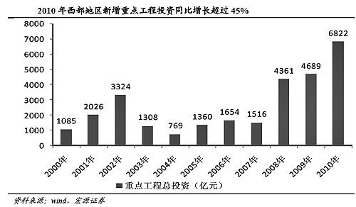 7月5日至6日,西部大開發(fā)工作會(huì)議在京召開。與此同時(shí),發(fā)改委7月5日的公告顯示,國家計(jì)劃2010年西部大開發(fā)新開工23項(xiàng)重點(diǎn)工程,總投資額為6822億元人民幣。這次重點(diǎn)工程的項(xiàng)目包括交通基建項(xiàng)目(10個(gè))、發(fā)電項(xiàng)目(7個(gè))、礦場項(xiàng)目(2個(gè))以及水利項(xiàng)目(4個(gè))。 券商認(rèn)為,此公告意味著在西部大開發(fā)戰(zhàn)略實(shí)施十周年后,西部開發(fā)將得以繼續(xù)深入。建議投資者重點(diǎn)關(guān)注成渝經(jīng)濟(jì)區(qū)(含重慶兩江新區(qū))和基建設(shè)施相關(guān)行業(yè)。