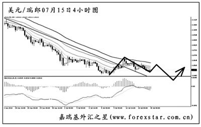 ▲美元兌瑞郎將下降趨勢線升破,目前在回探前方低點,此前MACD出現(xiàn)了幾次明顯的底背離信號,預計美元兌瑞郎將發(fā)生一波上行回調(diào),但幅度料將有限。圖中均線系統(tǒng)壓制匯價,后市再創(chuàng)新低的概率較大。由于日線圖強支撐在1.0435,美元兌瑞郎下跌的空間并不廣闊。