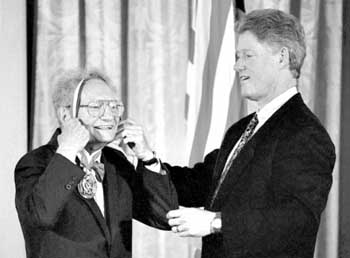這張1996年拍攝的照片顯示,在美國(guó)首都華盛頓白宮,保羅·薩繆爾森(左)與時(shí)任美國(guó)總統(tǒng)克林頓在一起。 新華社/法新 |