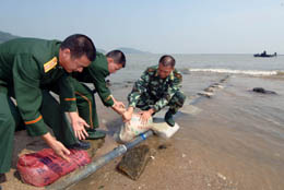 圖為廣東海警一支隊(duì)的官兵在檢查退潮后顯露出來(lái)的海上輸油管道。