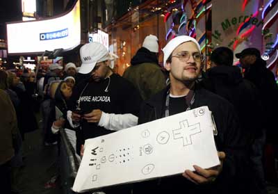 11月19日,在美國(guó)紐約的一家商店門口,比爾·盧戈手拿自畫的游戲機(jī)手柄示意圖排隊(duì)購(gòu)買Wii游戲機(jī)。當(dāng)天,任天堂新一代游戲機(jī)Wii正式在北美地區(qū)上市,拉開了Wii在全球銷售的帷幕。Wii在北美地區(qū)的定價(jià)為249.99美元,比微軟Xbox360和此前剛剛上市的索尼PS3都要便宜。