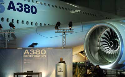12日,EADS法方聯(lián)席首席執(zhí)行官兼空客首席執(zhí)行官加盧瓦在法國南部圖盧茲舉行的空客A380客機飛行執(zhí)照授予儀式上致詞。當日,歐洲航空安全局和美國聯(lián)邦航空局正式授予空客A380客機飛行執(zhí)照,為客機明年開始交貨清除了最后一道技術(shù)關(guān)口。