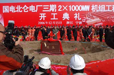 15日,國電北侖電廠三期工程兩臺(tái)1000MW超超臨界燃煤發(fā)電機(jī)組開工典禮在寧波舉行。兩臺(tái)燃煤發(fā)電機(jī)組建設(shè)的動(dòng)態(tài)總投資為80多億元,計(jì)劃于2009年全部建成投產(chǎn)。