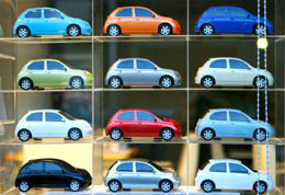 圖為日本東京一家汽車銷售店,銷售商將某汽車廠商生產的多款微型車模型擺在櫥窗里,以吸引顧客。本報記者:任正來 攝 |