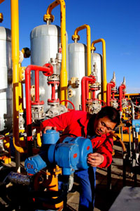 圖為一名工作人員在柴達木盆地澀北氣田首站檢查輸氣管線。