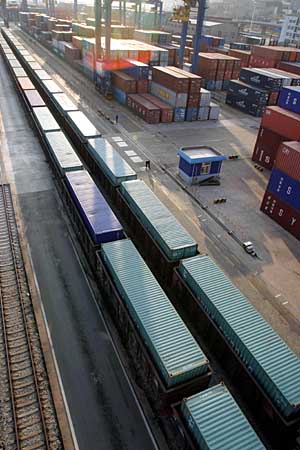 10月9日,連云港至莫斯科的國(guó)際鐵路集裝箱班列啟程。當(dāng)日,中海集團(tuán)與中鐵集運(yùn)公司聯(lián)手開通中國(guó)連云港至俄羅斯莫斯科的國(guó)際鐵路集裝箱班列,使新亞歐大陸橋過境集裝箱直達(dá)運(yùn)輸首次由中亞延伸到歐洲。首次開通的連云港至莫斯科的國(guó)際鐵路集裝箱運(yùn)輸班列有“五定”:定點(diǎn)、定線、定時(shí)、定距、定價(jià),每列共有48個(gè)車廂,可裝載96個(gè)國(guó)際標(biāo)準(zhǔn)集裝箱,沿新亞歐大陸橋運(yùn)輸25天可到達(dá)俄羅斯。 | |