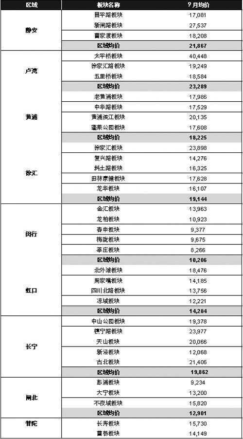 上海市各區(qū)域、各板塊均價(jià)(單位:元/平方米)