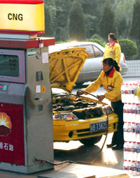 一位工人正在為一輛出租車加氣。記者從重慶市政府辦公廳獲悉,重慶壓縮天然氣(CNG)汽車保有量目前已達(dá)4萬輛,列全國城市之首。