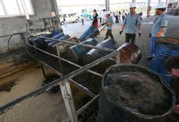 浙江某公司利用餐飲廢油生產(chǎn)柴油工藝,將一桶桶黑糊糊的“地溝油”經(jīng)沉淀、過濾、提純等系列工序后,變成了清潔環(huán)保的生物柴油。 | “高油價”背景下,就在河北不少地區(qū)加緊開工建設(shè)生物柴油項(xiàng)目時,3家已建成投產(chǎn)的生物柴油加工企業(yè)日前卻向記者反映,所需要的黃連木籽、泔水油、地溝油等原材料供應(yīng)不足,導(dǎo)致無法達(dá)到預(yù)期產(chǎn)能。他們認(rèn)為,這些表面看上去十分豐富的廢棄物,由于回收組織化程度低,并不能源源不斷地輸送給煉油企業(yè);此外,一些專家表示,由于目前廢棄油脂處理處于無序狀態(tài),廢棄油脂流向令人擔(dān)憂,這一系列問題亟待引起政府重視。