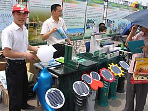 在濟南泉城廣場。太陽能光伏產(chǎn)品吸引了人們的目光。近年來,太陽能、風能方興未艾,將為改善我國能源結(jié)構(gòu)發(fā)揮更加重要的作用。本報記者