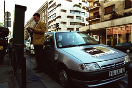 法國首都巴黎大力提倡使用電動汽車,以控制日益嚴(yán)重的城市廢氣和噪音污染。為此,巴黎市政府在全市范圍內(nèi)開展電動汽車街頭宣傳展示活動,并支持成立了電動汽車俱樂部,以負(fù)責(zé)推廣使用電動汽車。目前,巴黎已在市內(nèi)和郊區(qū)設(shè)立了40處電動汽車公共充電站。圖為一名男子在巴黎市區(qū)的電動汽車充電器前為自己的汽車充電。電動汽車充電一次只需10法郎,可連續(xù)行駛100公里。新華社記者:鄭宣