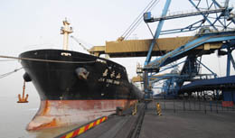 ?吭谔旖蚋勰辖捍a頭的“嘉永山”輪正在裝載5.5萬噸將運(yùn)往廣州的電煤。本報記者:劉海峰