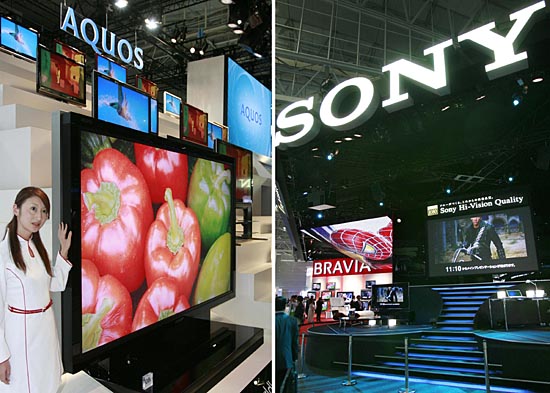 這張拼版照片顯示的是2007年10月2日,夏普公司(左)和索尼公司(右)在日本千葉舉行的一個電子產(chǎn)品交易展上展出各自的液晶顯示器產(chǎn)品。 26日,日本索尼和夏普公司宣布,兩家企業(yè)將成立合資公司,共同生產(chǎn)液晶顯示器(LCD)。兩家公司在當(dāng)天發(fā)表的聯(lián)合聲明中說,合資公司由夏普和索尼分別持股66%和34%。合資公司將為40英寸、50英寸和60英寸的平板電視生產(chǎn)液晶顯示屏。 | |