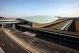 首都機場最早建成于1958年3月1日,當時的航站樓建筑面積10138平方米,高峰時每小時可接待旅客230人。改革開放后,民航進入快速發(fā)展時期。1991年,旅客吞吐量達到869.97萬人次,超過航站樓的設計能力,首都機場決定再建T2航站樓。航站樓主體33.6萬平方米,設計能力是在2005年吞吐量達到3500萬人次,高峰小時旅客吞吐量可達1.2萬人次。2000年以后,首都機場建設國際航空樞紐的理念越發(fā)明晰,再加上北京奧運會可預見的客流高峰,新航站樓T3應運而生。 T3是國際一流的,但是“很中國”。由交通中心上行,一道挑檐形成的紅色弧線緩緩升起,這是給人的最直觀感受。諾曼·福斯特告訴記者:“機場要為旅客集散功能提供解決方案,還要讓人們一看就知道,這里是北京!彼J為,這一設計體現著中國文化的內涵,而不是從某個地方飛來的東西。為此,福斯特給這一設計取了一個中國意味的名字——“人民的宮殿”。他表示,T3將成為中國過去20年來經濟快速發(fā)展的象征。 強調與中國文化的緊密聯系是諾曼·福斯特在投標中特意打出的一張牌。如果從T3的國內候機廳走到國際候機廳,你會發(fā)現屋頂網架的顏色從大紅變到金黃,經過16種色彩起伏漸變。由南向北穿行于候機樓中,這種紅到金黃的色彩漸變理念被擴大,從鋼架到柜臺再到座椅。 “你看那些紅色代表著熱情、奔放和喜慶,而金黃色則是紫禁城的主色調,代表著尊嚴和富貴!鄙垌f平認為,當人們看到如此大膽的色彩運用時,便會聯想起紫禁城的紅墻金瓦,聯想起中國民間的春聯和燈籠。而這樣個性化的色彩,將使得3號航站樓區(qū)別于所有中性色調的各國機場,而以一種更加自信和熱情的方式告訴人們:歡迎來到北京。 T3是座功能性的建筑,但其意義絕不僅限于一座航站樓那么簡單,借助2008年北京奧運會的契機,作為全球最大的單體航站樓,它與國家大劇院和央視新大樓以及國家體育場(鳥巢)一起,成為中國新時代的地標性建筑。
