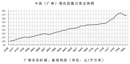 2008年1月,中原(廣州)領(lǐng)先指數(shù)為166.6,環(huán)比上月下降了2.4,降幅為1.5%。受買家觀望、市場(chǎng)成交不暢、一手房降價(jià)促銷等因素影響,中原領(lǐng)先指數(shù)1月繼續(xù)下行態(tài)勢(shì)。雖然1月份市場(chǎng)整體依然觀望,而且臨近春節(jié)是傳統(tǒng)的淡季,但因?yàn)椴糠謩傂孕枨笤?月集中釋放,所以交易量未繼續(xù)下降,支撐價(jià)格指數(shù)的下降幅度也有所收窄。