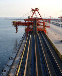 日前,國(guó)投曹妃甸煤炭碼頭一期工程基本完工,將于6月份投產(chǎn)。國(guó)投曹妃甸煤炭碼頭規(guī)劃建設(shè)5至10萬噸級(jí)煤炭泊位16個(gè),年煤炭下水能力2億噸。這是曹妃甸煤炭碼頭安裝完畢的裝船機(jī)。 本報(bào)記者:楊世堯