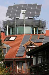 位于德國(guó)弗里堡沃邦節(jié)能社區(qū)的一幢房子上裝有太陽(yáng)能電池板。