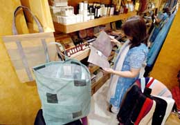 在印度新德里,一名店主查看用再生塑料制成的商品。一個(gè)民間環(huán)保組織團(tuán)體在新德里發(fā)起一項(xiàng)運(yùn)動(dòng):將使用過(guò)的塑料袋再利用做成時(shí)尚的婦女手袋、文件夾、鞋架、桌布、茶杯墊等日常用品。
