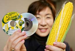 在日本東京JVC公司的辦公室里,一名雇員展示直徑8厘米的環(huán)保DVD光盤(pán)和玉米棒。JVC公司采用科技手段研制出了一系列環(huán)保光盤(pán),都是由以玉米淀粉為原料制成的塑料加工而成的。 |