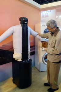 日前在上海舉行的“2008中國(guó)家電博覽會(huì)”上,國(guó)內(nèi)外廠商紛紛亮出最新的時(shí)尚家電產(chǎn)品。其中,液晶顯示屏在廚房家電上的普遍采用使家務(wù)勞動(dòng)更具趣味性;同時(shí),更人性化的時(shí)尚設(shè)計(jì)使家電產(chǎn)品讓家務(wù)勞動(dòng)更“省力”。圖為展會(huì)展出的全自動(dòng)熨衣機(jī)。