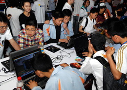 日前,第四屆中國(guó)國(guó)際動(dòng)漫產(chǎn)業(yè)博覽會(huì)在杭州開(kāi)幕。在看似簡(jiǎn)單的電子游戲、動(dòng)畫(huà)片等動(dòng)漫產(chǎn)業(yè)終端產(chǎn)品的背后,是一整條包括科技研發(fā)、制作、銷(xiāo)售和動(dòng)漫形象衍生產(chǎn)品開(kāi)發(fā)的產(chǎn)業(yè)鏈,據(jù)估計(jì),中國(guó)動(dòng)漫游戲產(chǎn)業(yè)年總產(chǎn)值在180億元左右。圖為一些學(xué)生圍聚在電腦前嘗試新的電腦游戲。 |